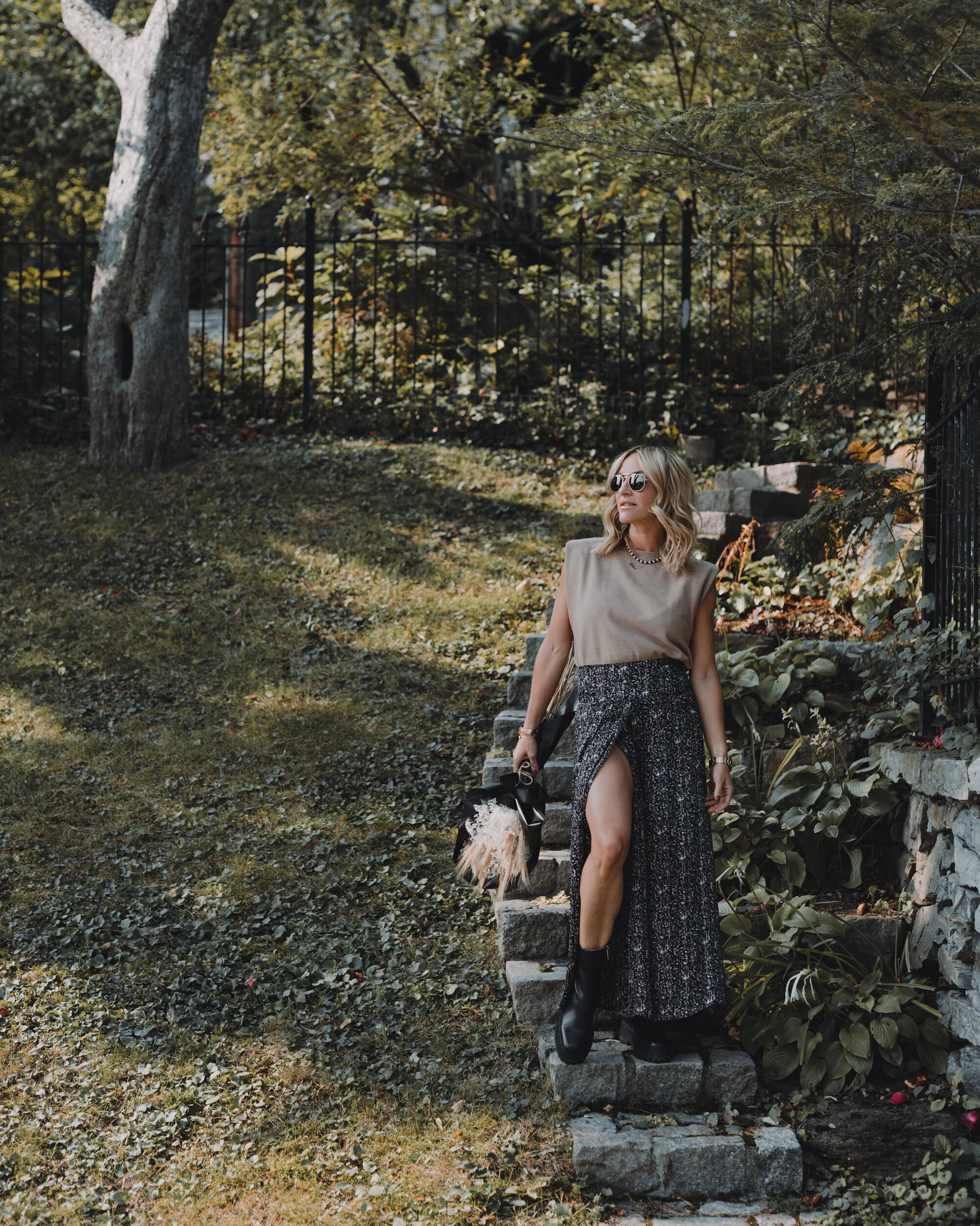 Paired a taupe should pad tee and a chunky black combat boot, I was to extend my wear and modernize the look to fit into fall. I threw on some gold accessories and waited for that perfect Indian summer fall day, and off I went.