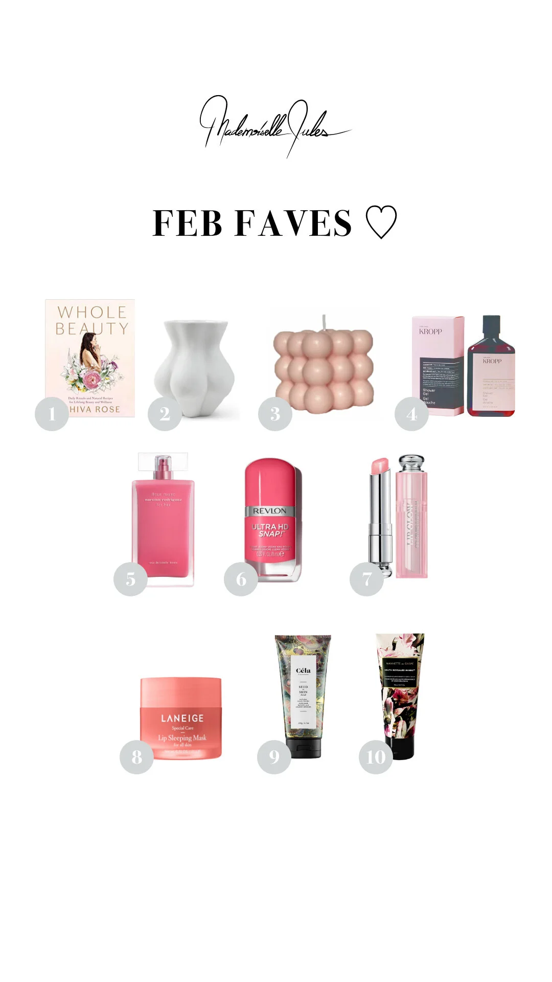 1. Whole Beauty by Shiva Rose | 2. Vase by Jonathon Adler | 3. Rosé Bubble Candle | 4. Kropp Shower gel | 5. Fleur Musc by Narciso Rodriguez | 6. Revlon Ultra HD Snap | 7. Reviver Balm by Dior | 8. LANEIGE sleeping care | 9. Céla Seed by Celine Tadrissi | 10. Youth Reveal hand cream by Nannette de Gaspe