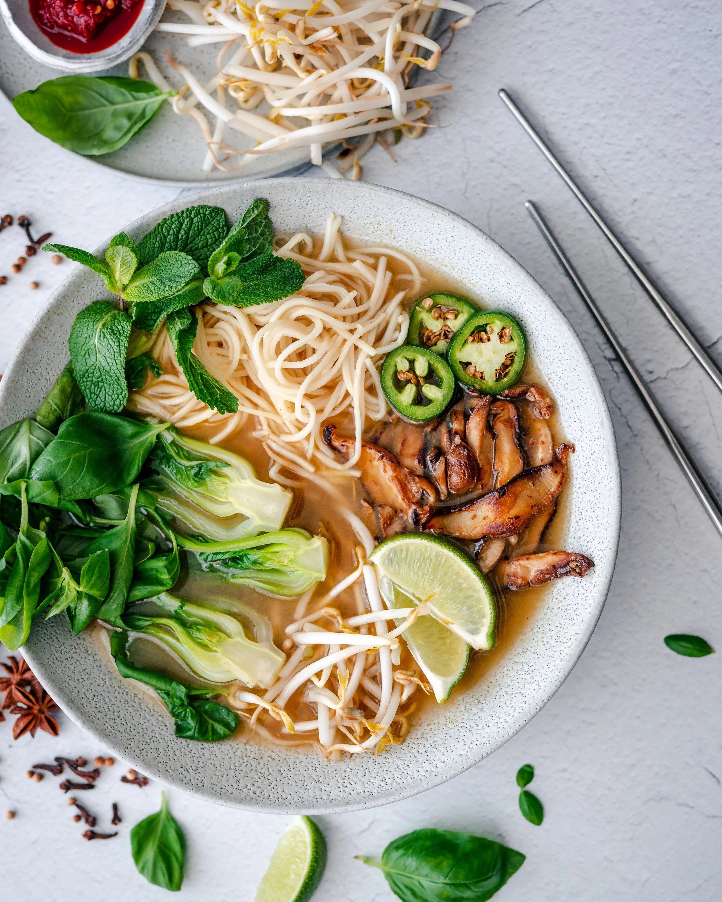 Pho soup is traditionally served in large soup bowls with chopsticks and a soup spoon. But that said, feel free to use whatever bowls you happen to have on hand at home. First, use your chopsticks to stir all of those yummy fresh garnishes into the broth to help give it extra flavor. Then- use your chopsticks to eat the noodles, protein and veggies, while using your spoon to eat the broth.