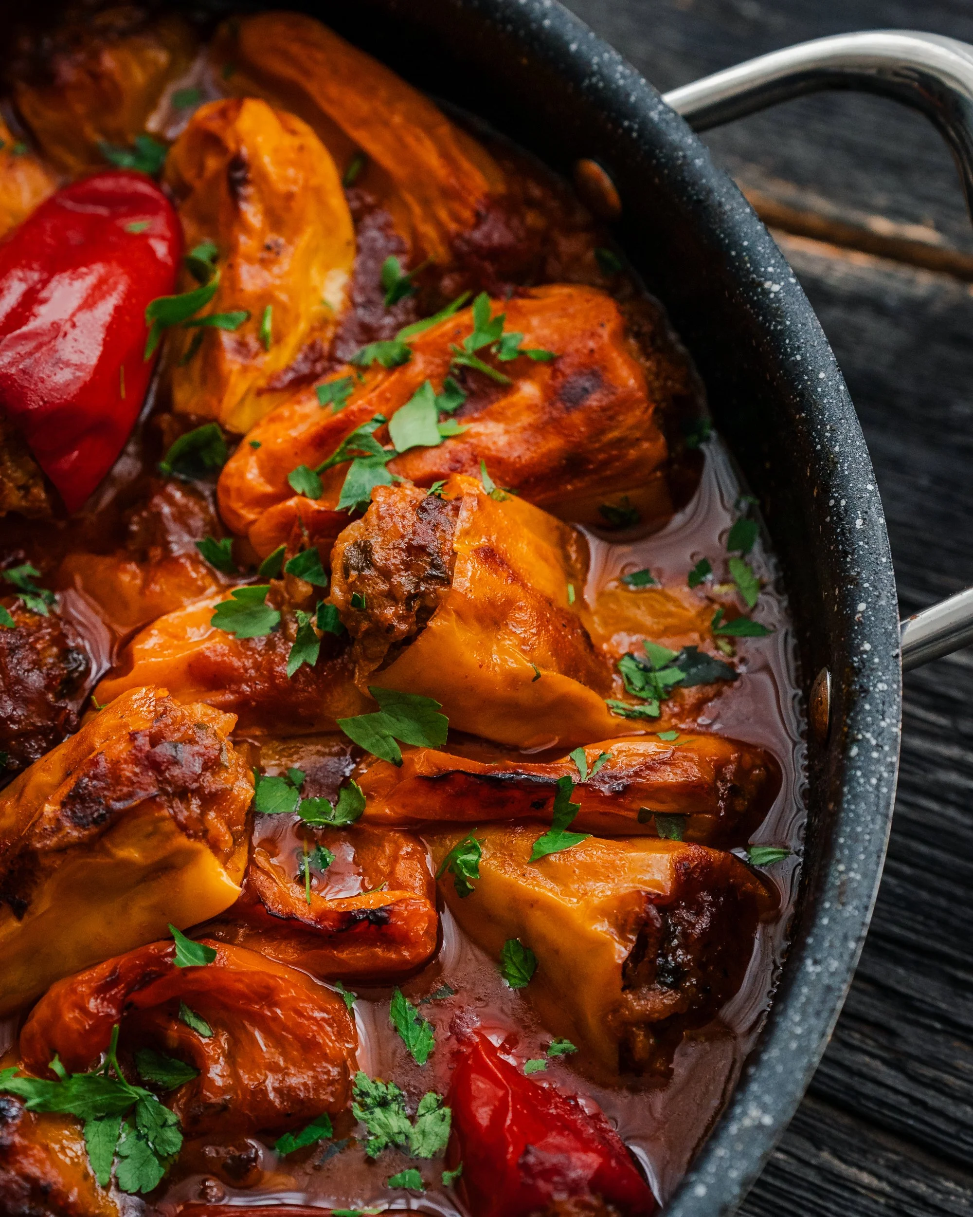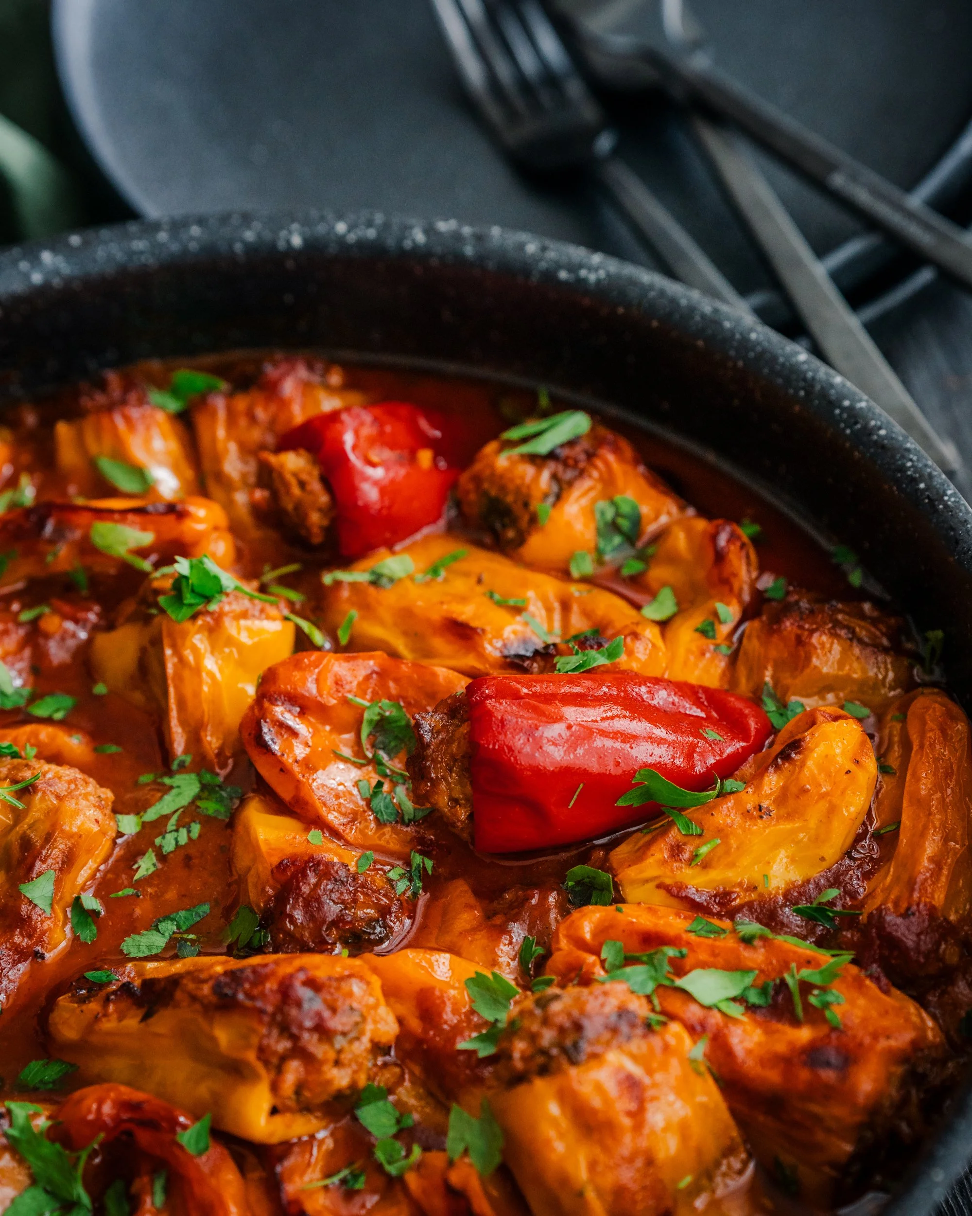 Pour the sauce over the stuffed peppers and bring it to a boil over medium heat. Cover the pot and let it simmer for about 20 minutes.