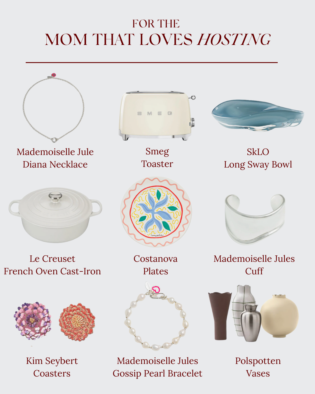 If her love language is setting the table, curating the perfect playlist, and making everyone feel at home—this guide is for the hostess mom. Whether she’s throwing garden parties, Sunday brunches, or just loves an excuse to open a bottle of wine, these gifts celebrate her gift for bringing people together. Think elevated entertaining essentials, thoughtful touches, and pieces that add beauty to every gathering she creates.