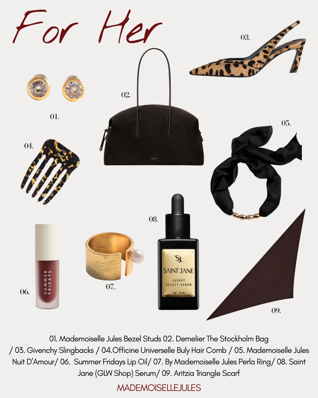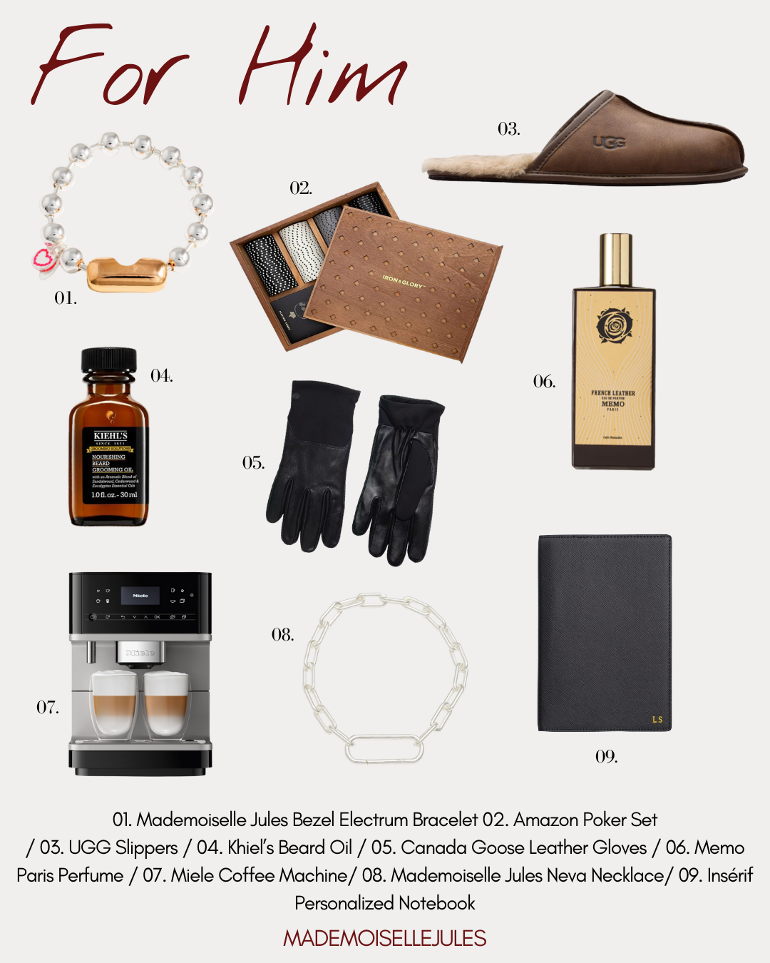 01. Mademoiselle Jules Electrum Bracelet/ 02. Amazon Poker Set / 03. UGG Slippers / 04. Khiel’s Beard Oil / 05. Canada Goose Leather Gloves / 06. Memo Paris Perfume / 07. Miele Coffee Machine/ 08. Mademoiselle Jules Neva Necklace/ 09. Insérif Personalized Notebook