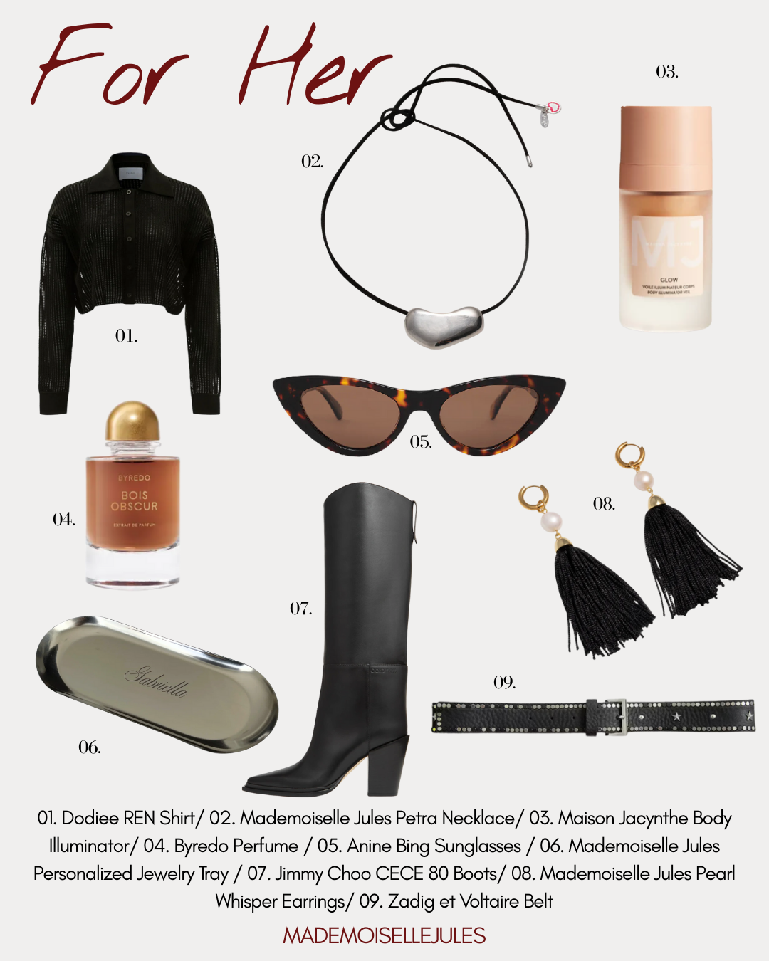 01. Dodiee REN Shirt/ 02. Mademoiselle Jules Petra Necklace/ 03. Maison Jacynthe Body Illuminator/ 04. Byredo Perfume / 05. Anine Bing Sunglasses / 06. Mademoiselle Jules Personalized Jewelry Tray / 07. Jimmy Choo CECE 80 Boots/ 08. Mademoiselle Jules Pearl Whisper Earrings/ 09. Zadig et Voltaire Belt